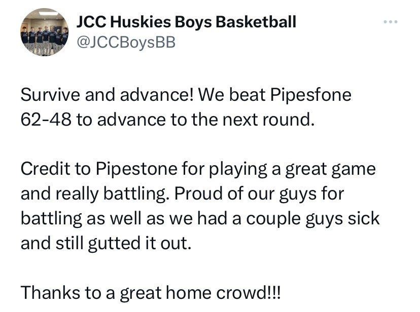 The box score from JCC’s first-round win over Pipestone: