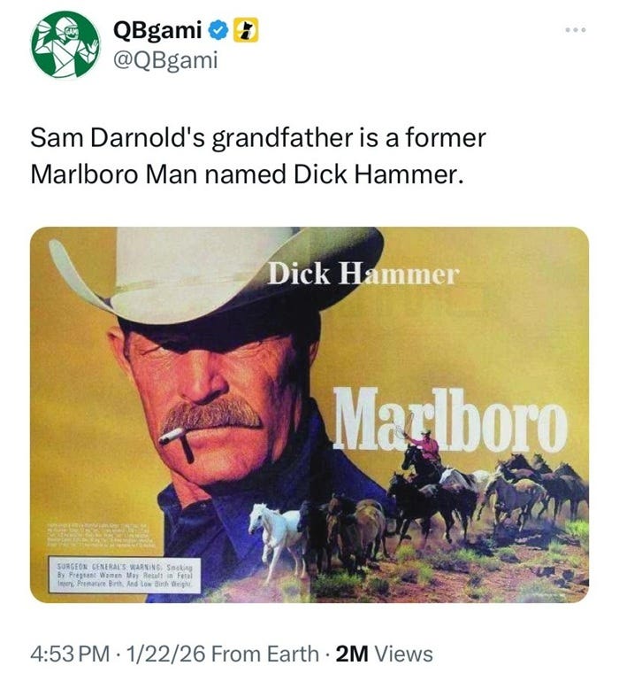 Seattle QB Sam Darnold’s grandfather, Dick Hammer, was the “Marlboro Man,” the rugged-looking, square-jawed man who graced billboards, newspaper and magazine ads wearing a cowboy hat with a cigarette hanging out of his mouth.