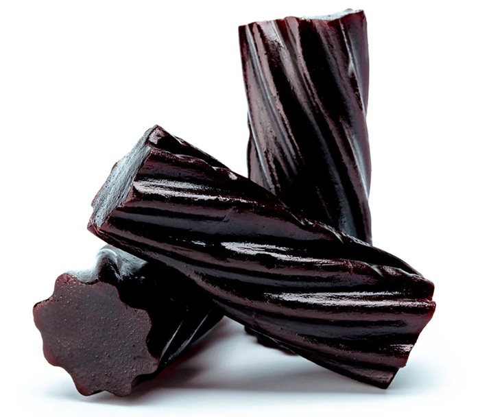 Licorice is a confectionery flavored with the extract of the Glycyrrhiza glabra root, traditionally colored black with sugar, flour, and binders, and known for its distinct sweet, slightly bitter taste.
